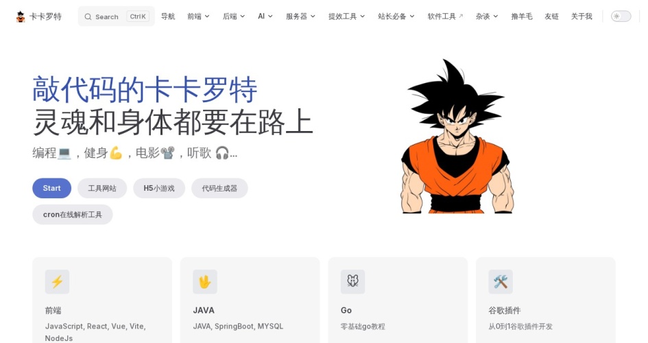 “敲代码的卡卡罗特”的个人博客,博客主张“灵魂和身体都要在路上”,内容涵盖编程、生活、实用工具等多个方面。精品导航,程序猿工具集,常用业务代码分享,java&VUE代码生成器,音乐电影动漫分享,健身记录,黑科技分享,AI技术,独立站长,SEO