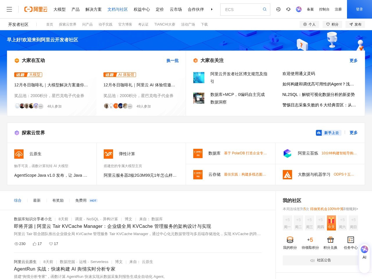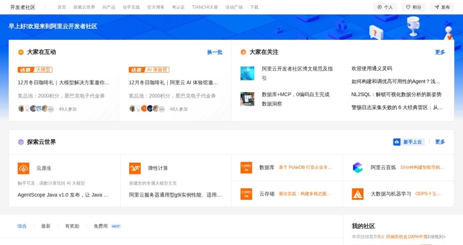 阿里云开发者社区是阿里云旗下的开发者综合服务平台,核心围绕云计算、人工智能、开发技术等领域,提供技术分享、实战教程、工具资源与行业动态,为开发者打造学习、实践与交流的全场景生态。