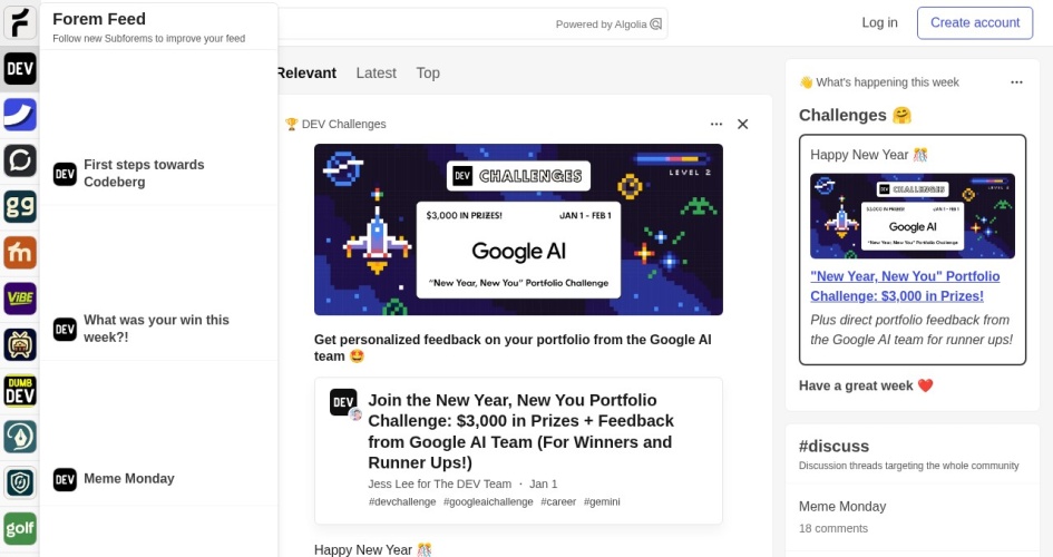 devto是一个开发者社区,目前有359万多名开发者用户。网站的赞助方包括Google AI、Neon、Algolia等,分别担任AI模型和平台、数据库、搜索方面的合作角色。网站基于Forem开源软件搭建,核心用途是让开发者讨论软件开发相关话题、了解行业动态以及规划自己的职业发展。